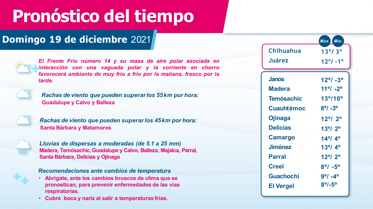 Para este domingo 19, el Frente Frío No. 14 y su masa de aire polar asociada en interacción con la Segunda Tormenta Invernal, una vaguada polar y la corriente en chorro mantendrá temperaturas muy frías a frescas por la tarde, con rachas que pueden superar los 55 km/h en Guadalupe y Calvo y Balleza; pueden superar los 45 km/h en Guachochi, Santa Bárbara y Matamoros.