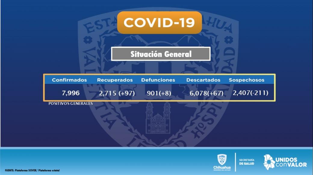 El informe técnico de la Secretaría de Salud Chihuahua sobre la situación de la pandemia de COVID-19 en el estado, señala que hay 7 mil 996 casos confirmados y se sumaron 8 defunciones más, para un total de 901 personas fallecidas.
