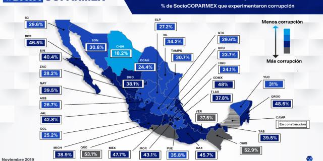 En el otro extremo de la tabla, hay estados que superan el 50% en respuestas afirmativas de los socios Coparmex en cuanto a haber experimentados actos de corrupción en su interacción con el Gobierno.