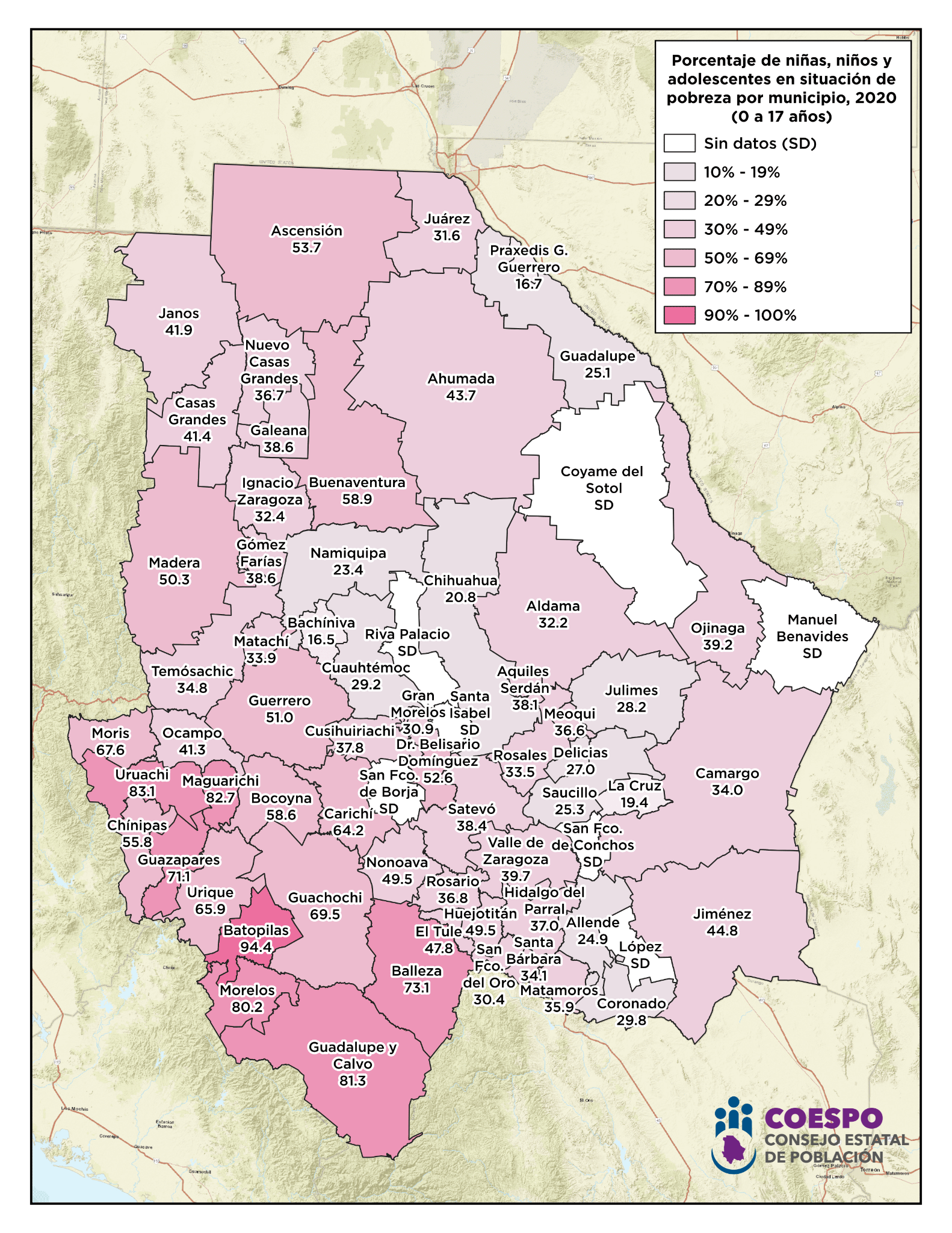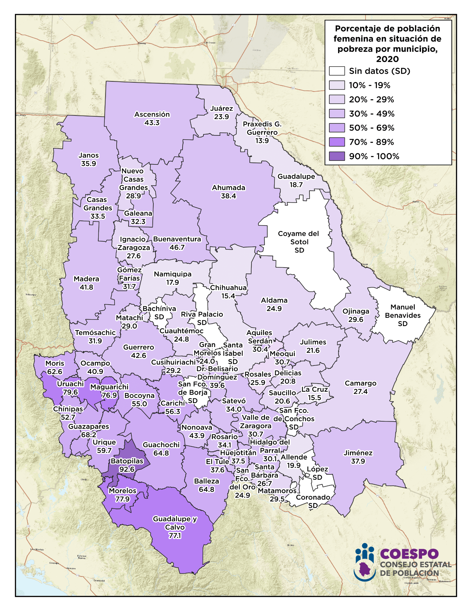 A continuación, encontrarás representado de manera visual, mapas elaborados por el Consejo Estatal de Población sobre la situación de pobreza por grupos poblacionales en los distintos municipios del Estado de Chihuahua al año 2020.