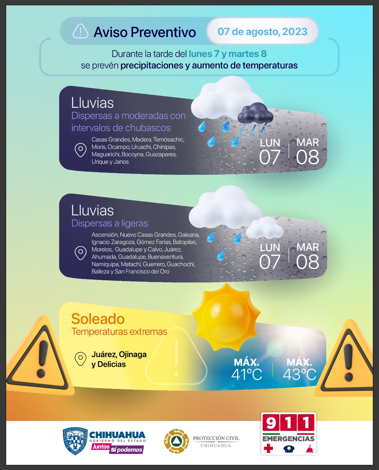 Durante este lunes 7 de agosto se espera un aumento de temperaturas en Juárez con 41 grados centígrados (°C), Ojinaga 43°C y Delicias 41°C, mientras que en la Ciudad de Chihuahua el termómetro llegará hasta los 38 °C y para la región serrana los valores irán desde los 27 hasta los 30 °C.