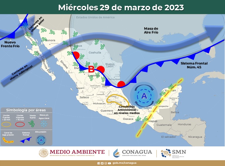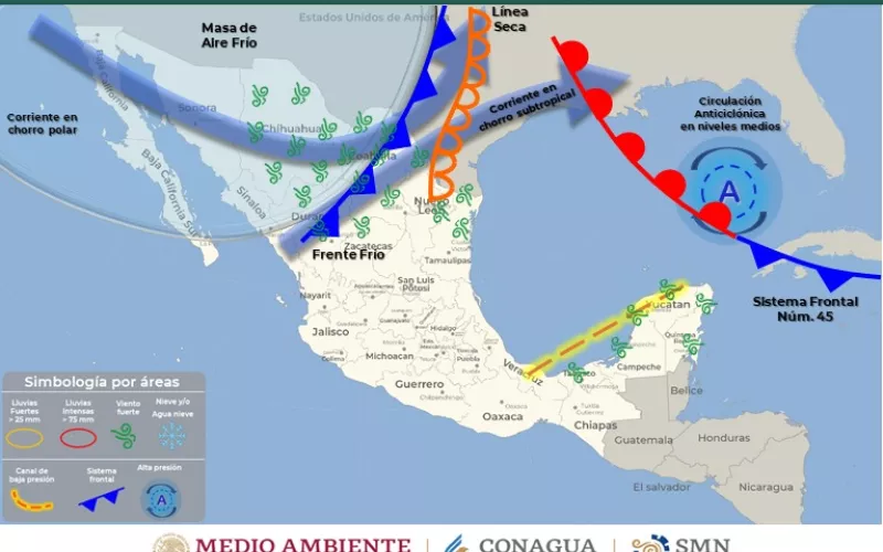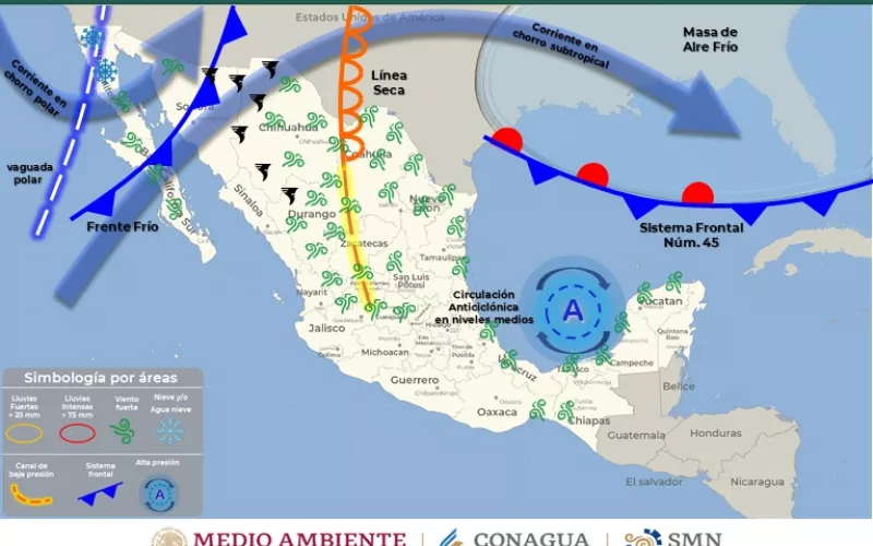 Con base a la información emitida por el Servicio Meteorológico Nacional, la CEPC refiere que el potencial Frente Frío número 46 ingresará y recorrerá el noroeste y norte de México. Éste, en interacción con una vaguada polar, las corrientes en chorro polar y subtropical, y un canal de baja presión, podrían generar lluvias aisladas en la región serrana.