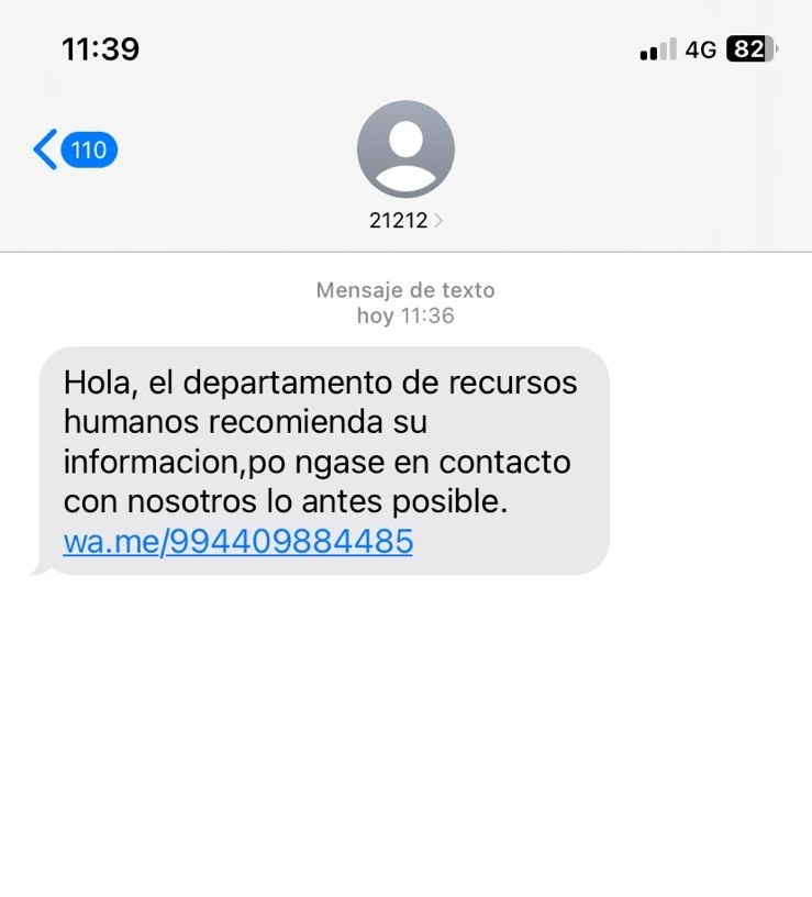 El aviso fraudulento proviene del número 21212 e incluye el siguiente mensaje: “Hola, el departamento de recursos humanos recomienda su información, póngase en contacto con nosotros lo antes posible”.