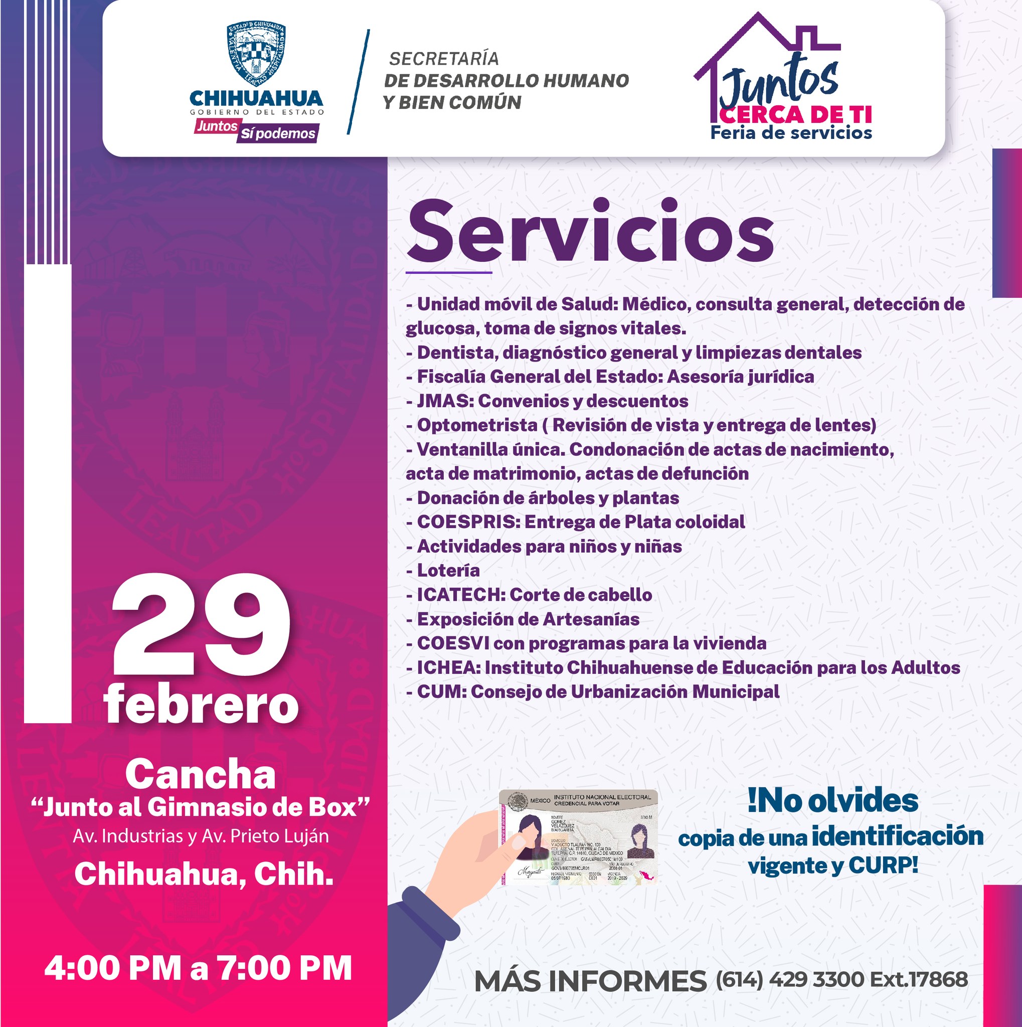 La Secretaría de Desarrollo Humano y Bien Común (SDHyBC) dio a conocer que este jueves 29 de febrero, llevará la feria de servicios "Juntos Cerca de Ti" a la colonia Sahuaros, ubicada al norte de la ciudad de Chihuahua.