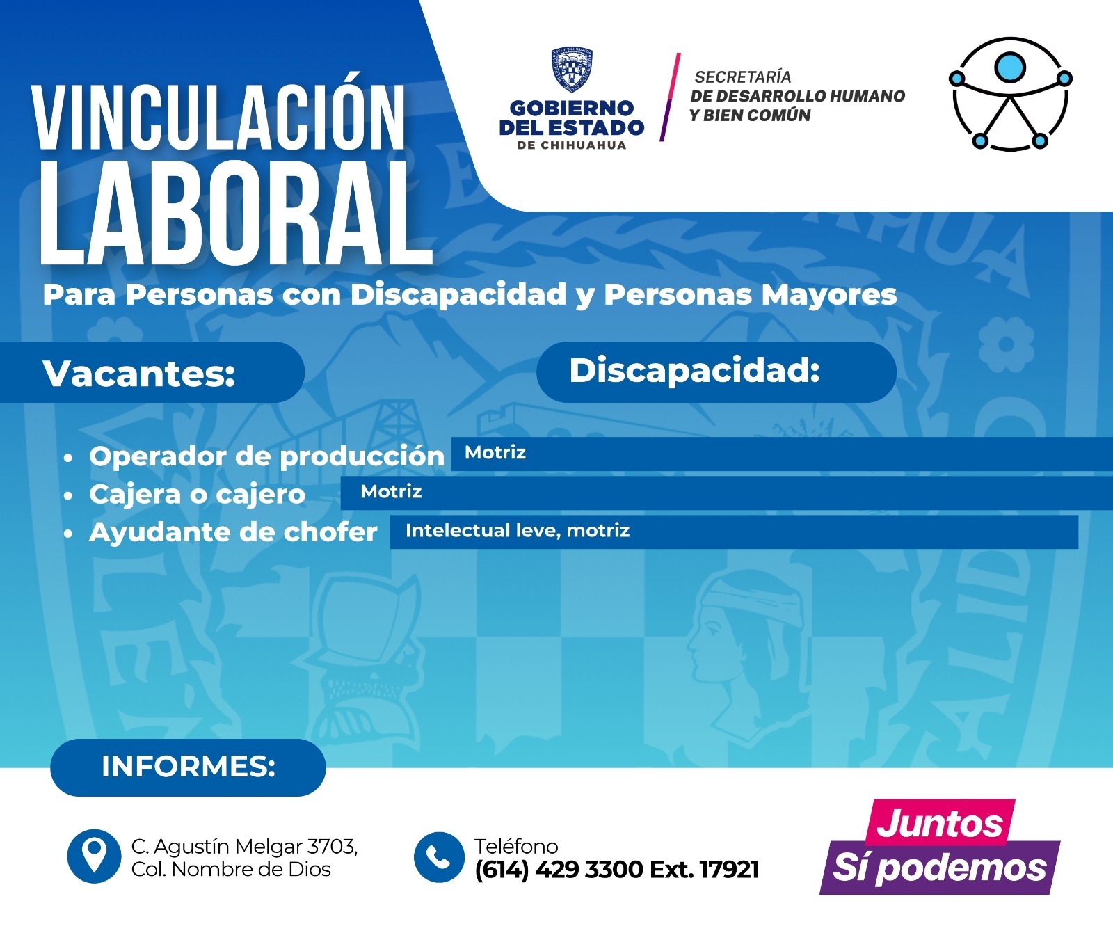 La SDHyBC invita a las y los interesados a comunicarse al teléfono (614) 429-33-00, extensión 17921, o acudir a las oficinas de Grupos Vulnerables, ubicadas en avenida Agustín Melgar 3703, colonia Nombre de Dios, en un horario de 8:00 a 16:00 horas.