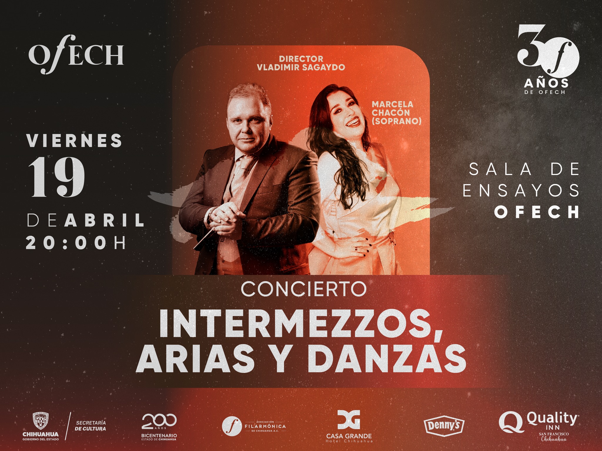 En el marco de la celebración por el 30 Aniversario de la Orquesta Filarmónica del Estado de Chihuahua (OFECh), la Secretaría de Cultura invita al concierto “Intermezzos, Arias y Danzas”, que estará bajo la batuta del director invitado Vladimir Sagaydo y la participación de la soprano Marcela Chacón.