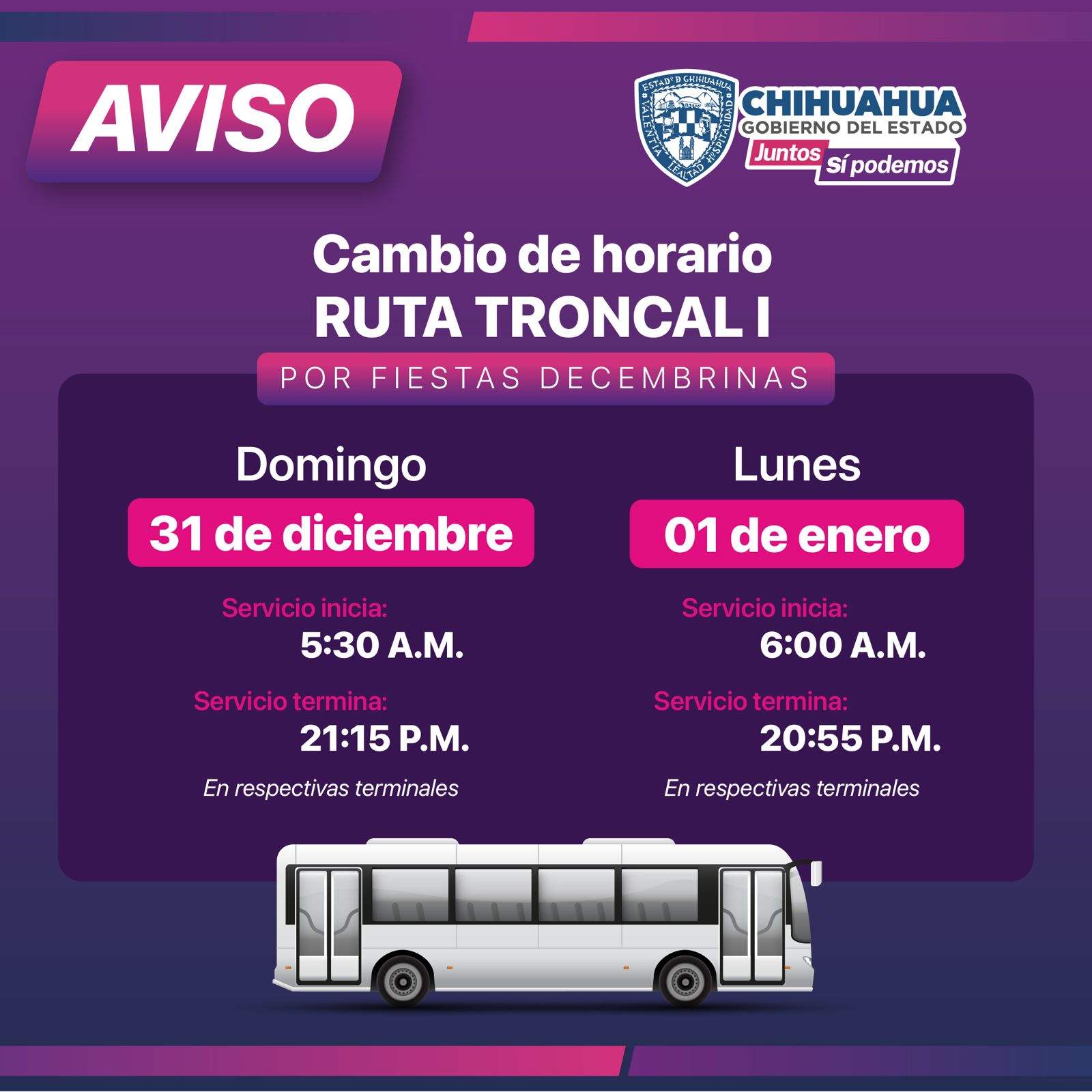 Los cambios en los horarios serán de la siguiente manera: para el 31 de diciembre, la primera salida será las 5:30 horas y la última llegará a las 21:15 horas, en las terminales norte y sur.