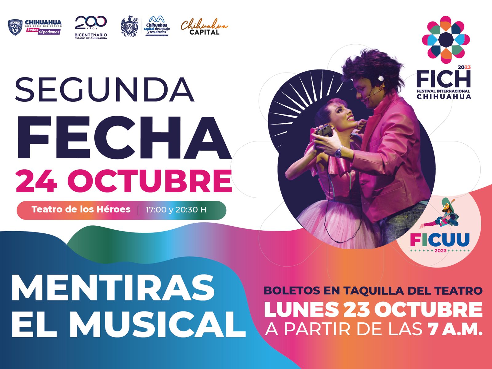 Este martes 24 de octubre se presentarán dos funciones más de la obra "Mentiras El Musical", como parte de las actividades del Festival Internacional Chihuahua (FICH) y el Festival Internacional de la Ciudad de Chihuahua (FICUU).