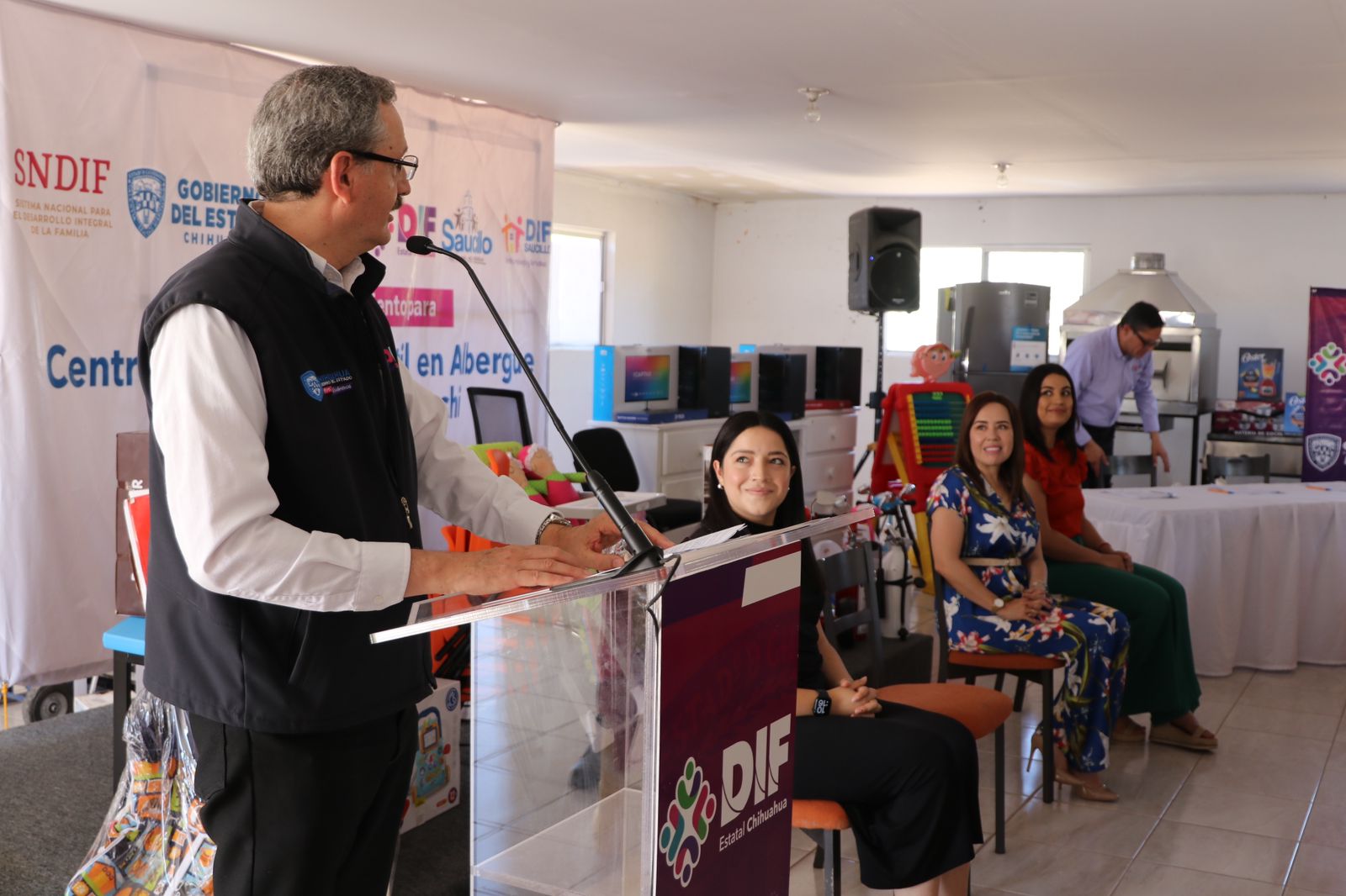 En el evento también estuvieron presentes Manuela Aidé López de Anda, alcaldesa de Saucillo; Donata Estefanía García López, presidenta del DIF Municipal, y Carmen Azucely Medina, titular del albergue Betebachi.