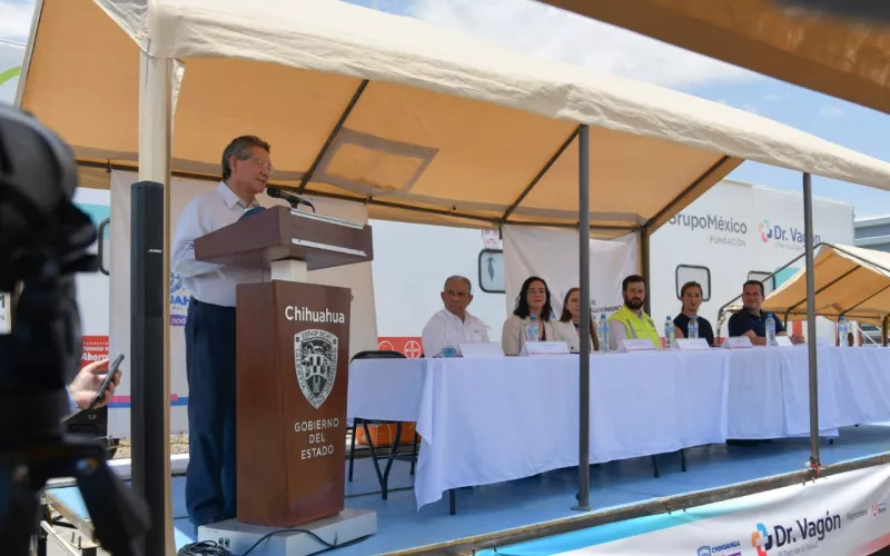 A la ceremonia que dio cierre a la gira del Dr. Vagón por el estado de Chihuahua, acudieron también Octavio Villegas, subsecretario de Desarrollo Humano y Bien Común; Rogelio Covarrubias, director de Servicios Médicos de la Zona Norte y Héctor Facundo, coordinador Operativo del Dr. Vagón.