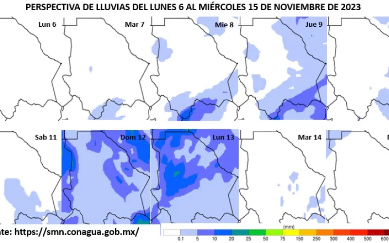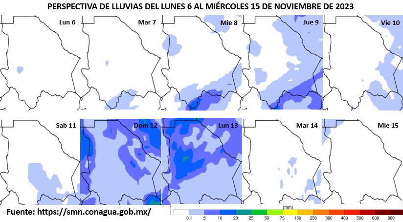 Se espera que continúen las lluvias aisladas (de 0.1 a 2 mm) en partes de las zonas suroeste y sur, que incluyen a Guadalupe y Calvo, Balleza, San Francisco del Oro, Santa Bárbara, Matamoros y Coronado.