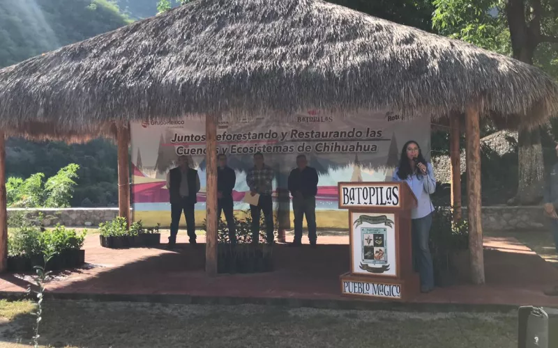 En su participación, el anfitrión del evento, Eduardo Aarón Ruelas, presidente Municipal de Batopilas de Manuel Gómez Morín, agradeció la asistencia de las autoridades y a los representantes de la iniciativa privada, explicando que el actual programa contribuye en la restauración ecológica, el cual es el proceso de impulsar la recuperación de vegetación que ha sido degradada o destruida, para restaurar la salud e integridad de nuestros ecosistemas en el estado. “Uno de los principales retos es lograr una restauración efectiva a través de la reforestación a escala estatal buscando el fortalecimiento del arbolado, la conservación de la biodiversidad, una mayor cobertura forestal y la protección del suelo y de los servicios ambientales”.