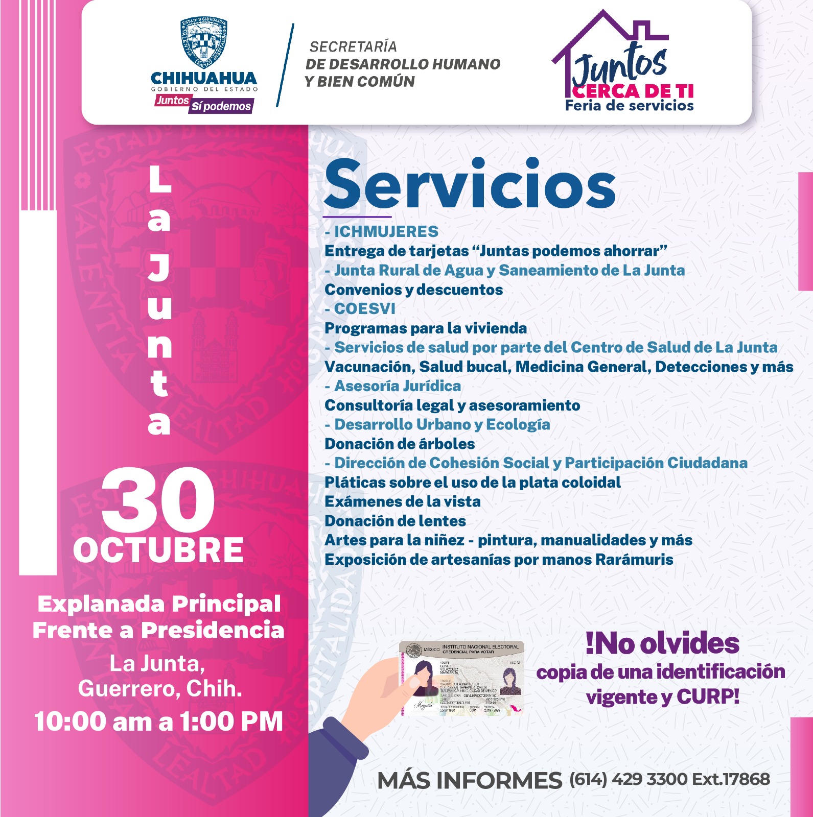 Con el objetivo de atender las necesidades de la población vulnerable mediante diversas acciones, la feria de servicios gratuitos “Juntos Cerca de Ti” de la Secretaría de Desarrollo Humano y Bien Común (SDHyBC), visitará hoy lunes 30 de octubre La Junta, municipio de Guerrero.
