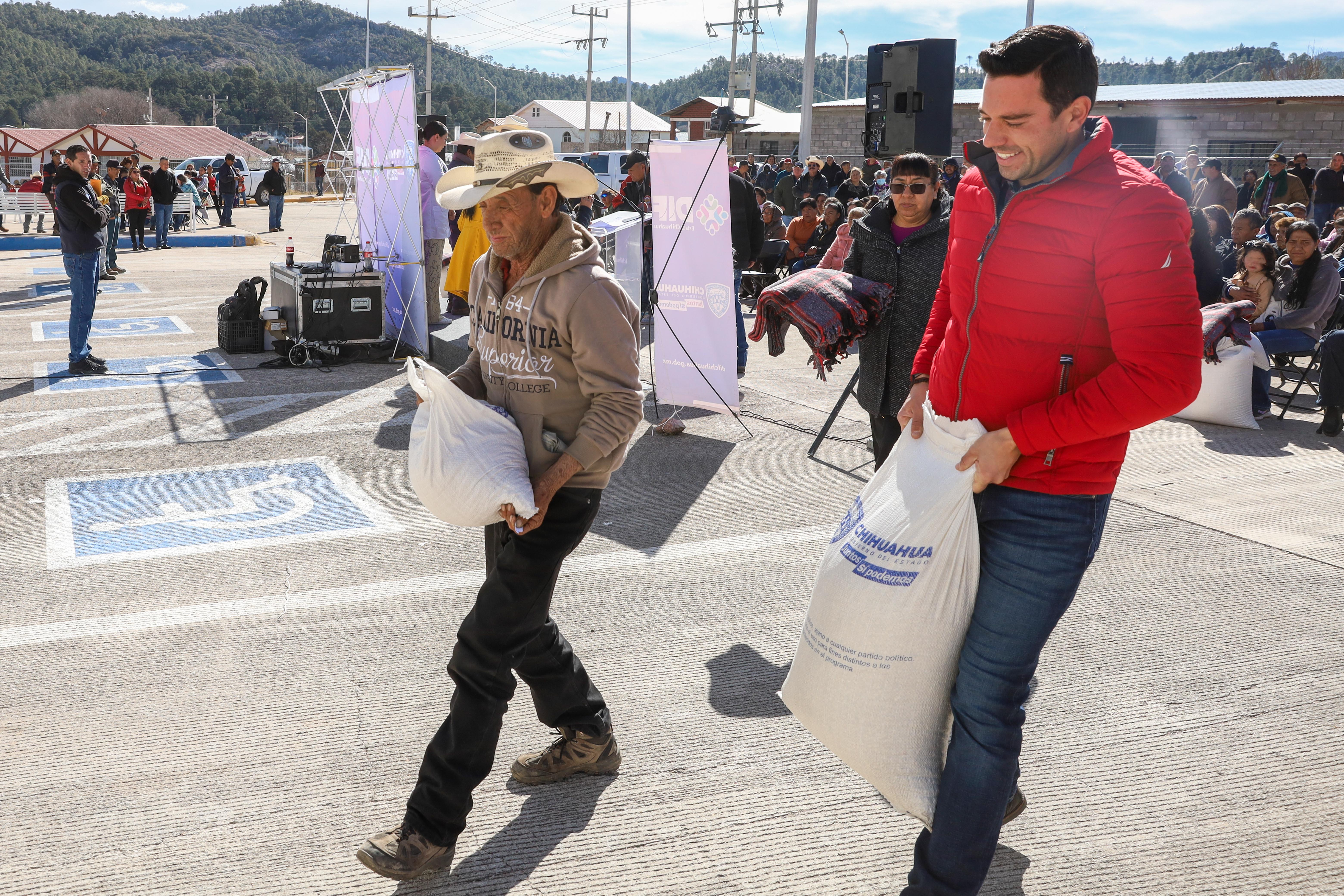 Como parte de la estrategia interinstitucional del Gobierno del Estado contra la sequía, el DIF Estatal, la Secretaría de Pueblos y Comunidades Indígenas (SPyCI) y la Secretaría de Desarrollo Humano y Bien Común (SDHyBC), distribuyeron paquetes alimentarios para 500 familias de la población de Basaseachi, municipio de Ocampo.