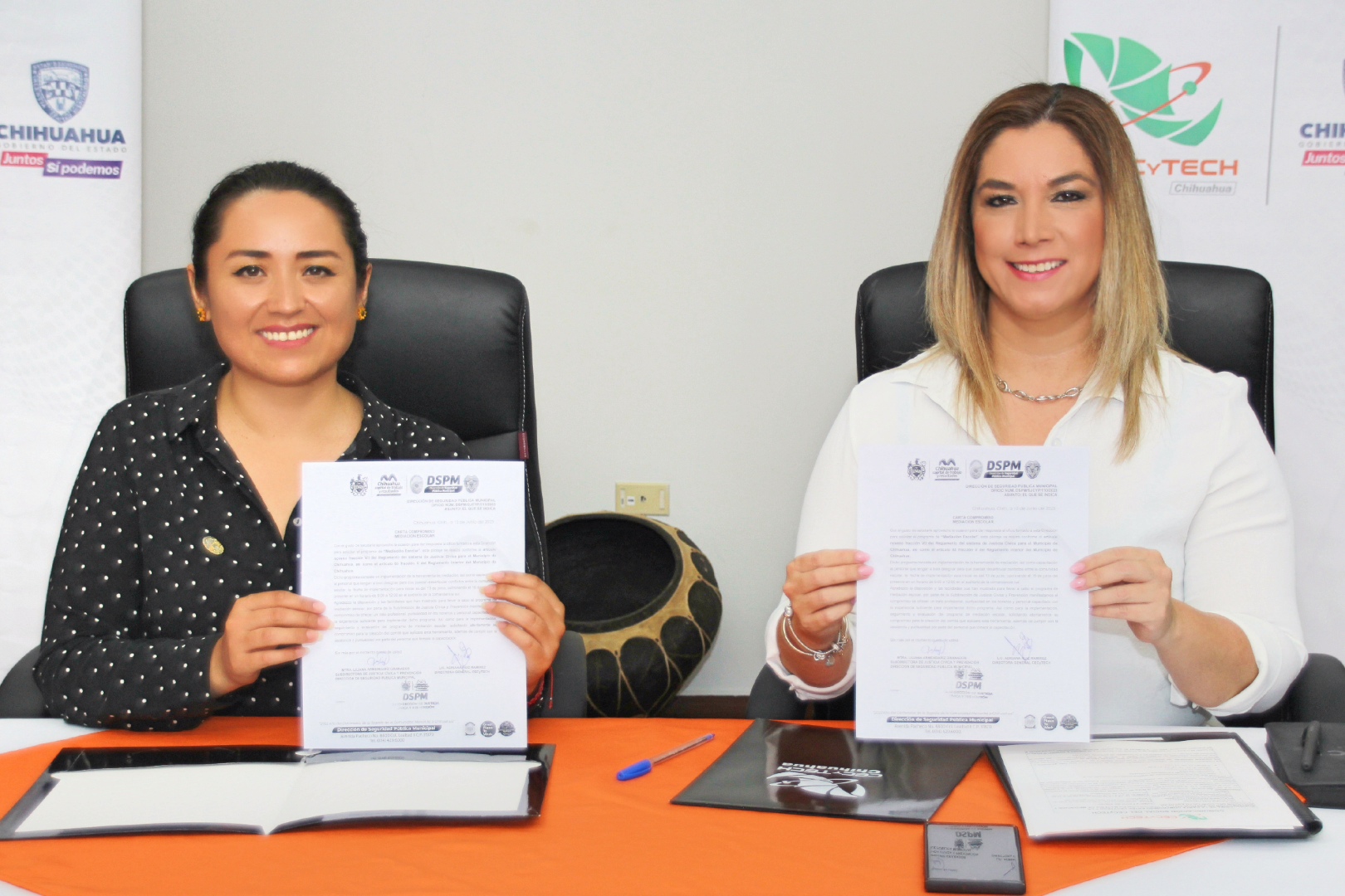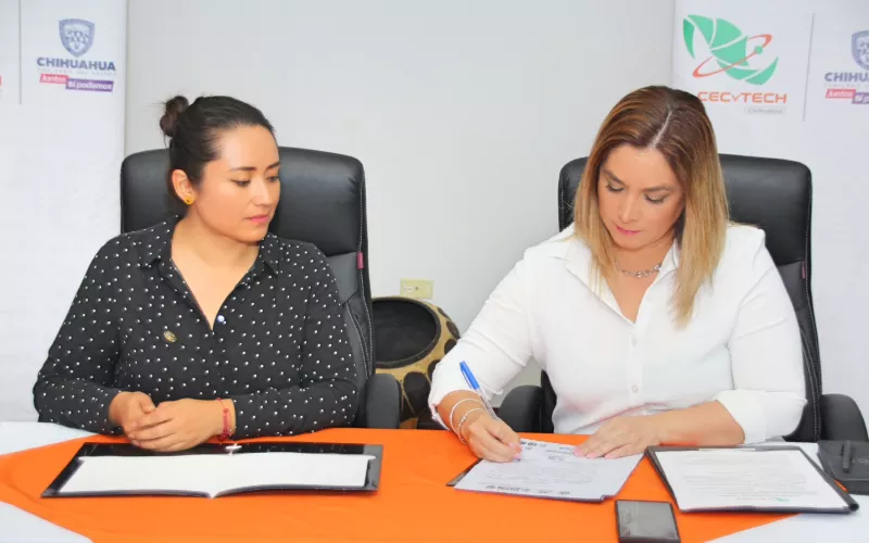 Adriana Ruiz, directora general del CECyTECH, y Liliana Armendáriz, subdirectora de Justicia Cívica y Prevención de la DSPM, firmaron la carta compromiso a través de la cual el personal docente, administrativo y directivo del Colegio tendrá la posibilidad de participar en la capacitación que se llevará a cabo durante tres días en la Comandancia Sur de esta corporación municipal.