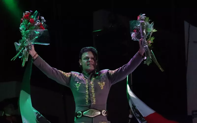 Al ritmo de su famosa "Canción del Mariachi", el artista mexicano arribó al escenario en punto de las 8:30 de la noche, ataviado con un traje de charro gris y una majestuosa capa roja que lo hicieron adueñarse del recinto desde ese momento, entre los gritos y aplausos de la gente que esperaba ansiosa su presencia.