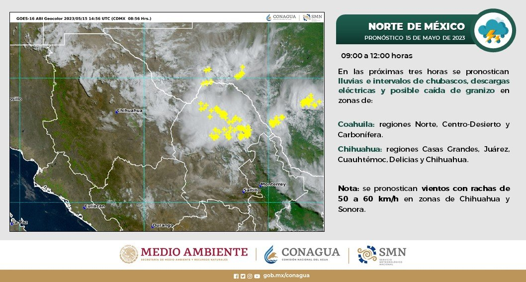 La Coordinación Estatal de Protección Civil, da a conocer las condiciones climáticas esperadas para este lunes 15 y martes 16 de mayo, en distintas regiones del estado de Chihuahua.