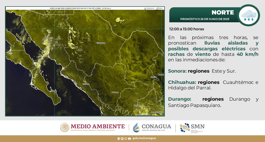 La dependencia informó que se prevén lluvias ligeras sobre Juárez, Ascensión, Janos, Casas Grandes, Madera, Moris, Uruachi, Chínipas y Guazapares, que pueden estar acompañadas de caída de granizo y tormentas eléctricas.