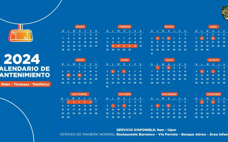 El calendario contempla un programa mensual, que incluye la inspección del Teleférico, del ZipRider y el Circuito de 7 Tirolesas, que solo permanecerán abiertas al público de las 9:00 a las 12:00 horas.