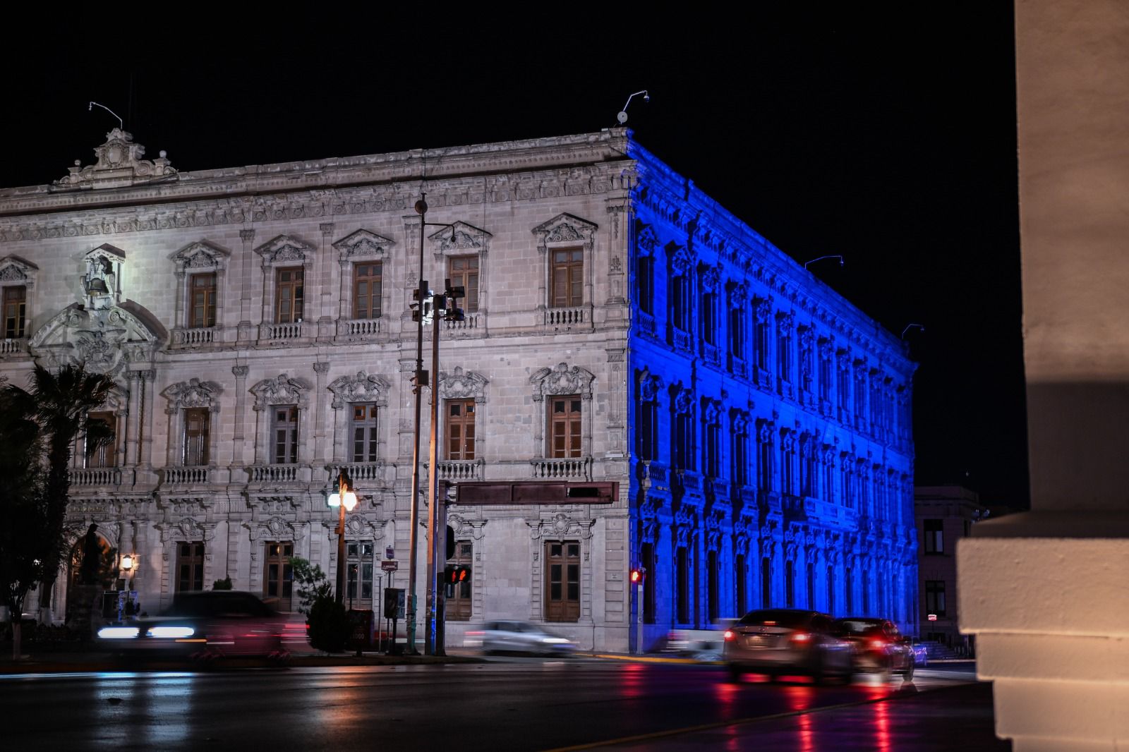 Desde poco antes de las 19:30 horas, la sede del Ejecutivo estatal lució la tonalidad, que podía verse desde la avenida Carranza y la Plaza del Ángel.