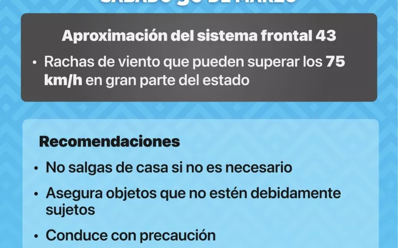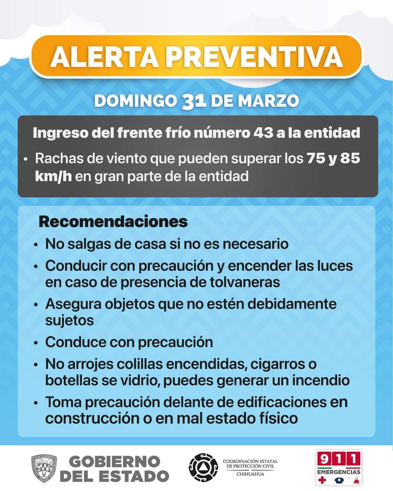 Para hoy se esperan rachas de viento de hasta 75km/h en Casas Grandes, Ignacio Zaragoza, Gómez Farías, Buenaventura, Namiquipa, Bachíniva, Guerrero, Bocoyna, Carichí, Guachochi, Guadalupe y Calvo, Nonoava, Cuauhtémoc, Riva Palacio, Gran Morelos, Chihuahua (Majalca) y San Francisco del Oro.