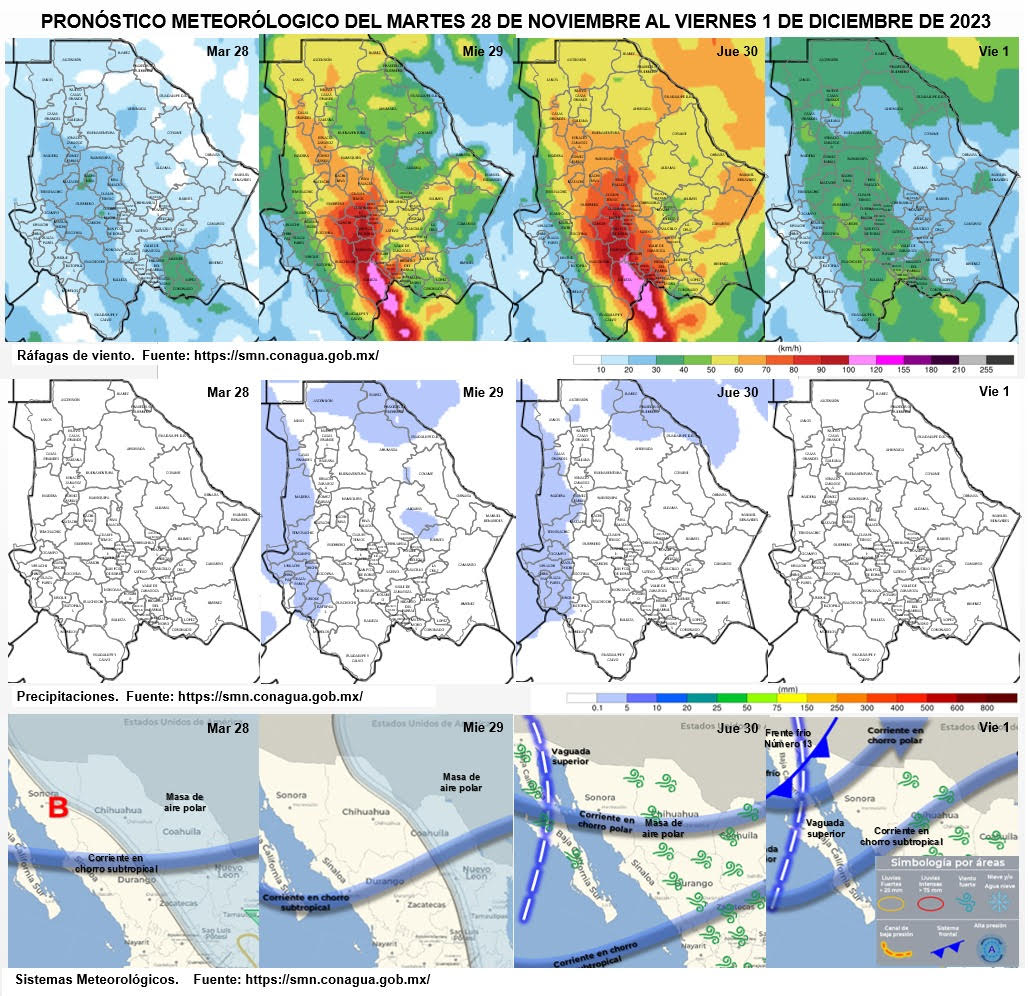 En Madera, Ignacio Zaragoza, Gómez Farías, Namiquipa, Bachíniva, Guerrero, Bocoyna, Guadalupe y Calvo, Riva Palacio, Majalca, Satevó y Parral, se pronostica que las rachas registren velocidades de hasta 65 km/h.