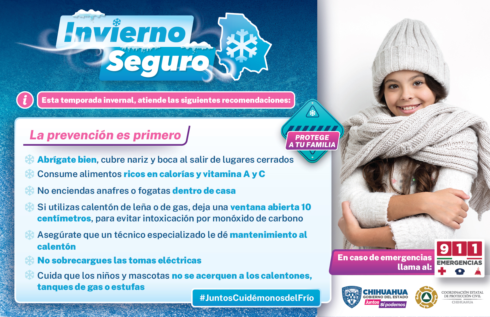 También se pide evitar exponerse a cambios bruscos de clima, y a cuidar especialmente a la población más vulnerable como lo son niñas, niños, personas adultas mayores y enfermos crónicos, ya que son más susceptibles a las bajas temperaturas.