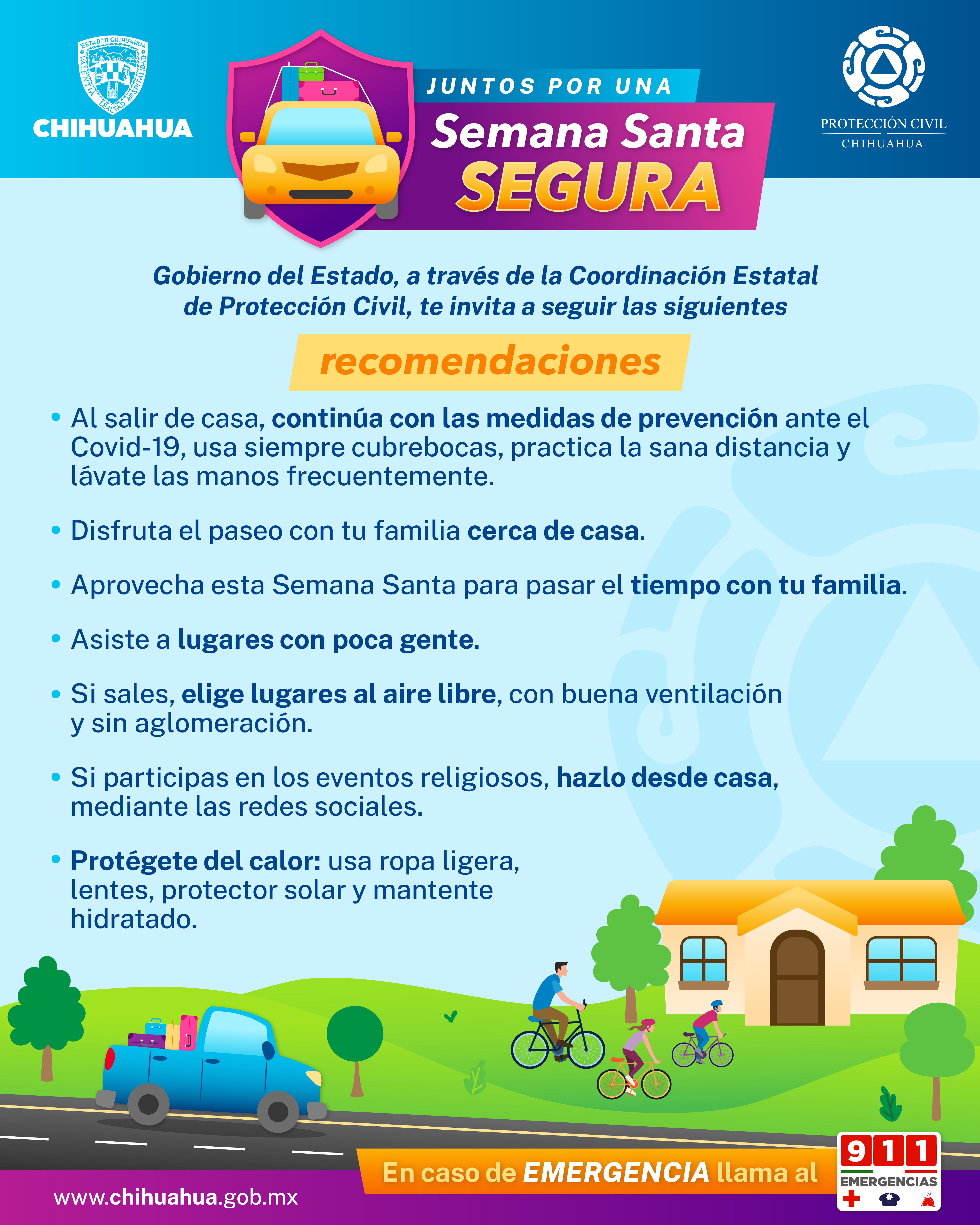 La Coordinación Estatal de Protección Civil (CEPC) del Gobierno del Estado de Chihuahua emitió una serie de recomendaciones para las personas que visitan la entidad o viajan fuera de la misma, durante estas vacaciones de Semana Santa.