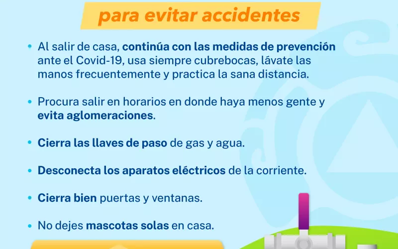 Al salir de casa deben revisar puertas y ventanas, cerrar las válvulas de agua y de gas, desconectar aparatos electrónicos y avisar a algún familiar que saldrás para que esté pendiente de tu casa.