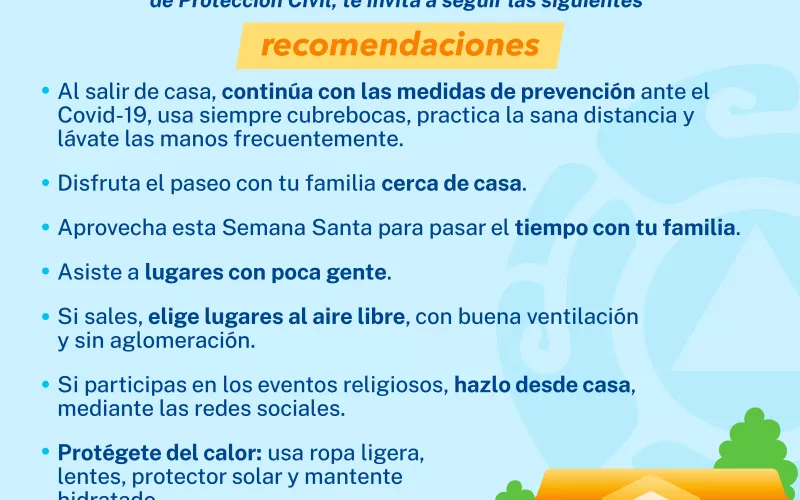 Para quienes acudirán el Jueves Santo y Viernes Santo a templos, procesiones o representaciones, se recomienda ir bien hidratado; portar sombrero, gorra o visera; usar ropa de algodón de colores claros; así como calzar zapatos cómodos.
