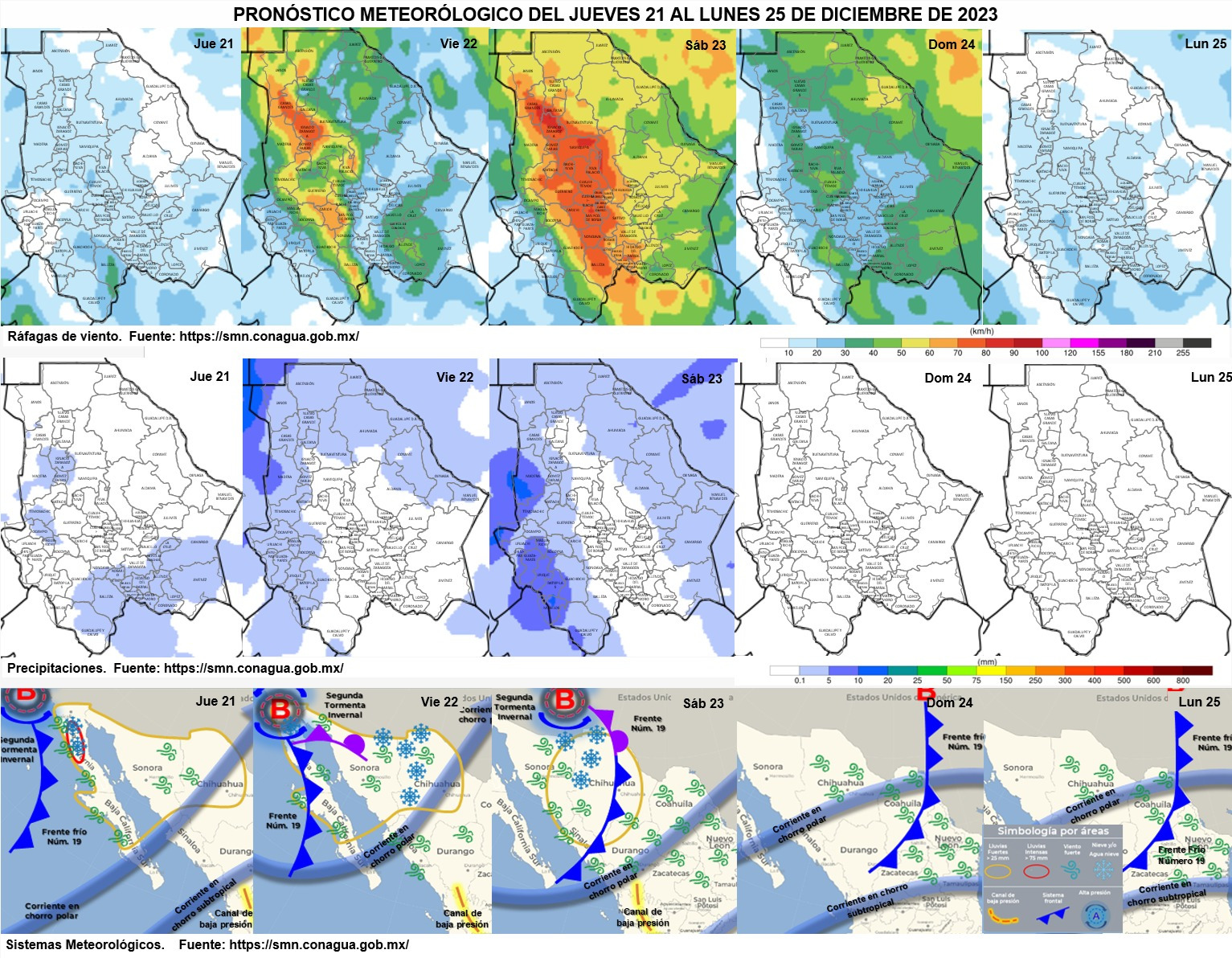 Con base en el pronóstico del Servicio Meteorológico Nacional, la instancia informó que este viernes ambos fenómenos se desplazarán a territorio chihuahuense desde la península de Baja California y ocasionarán rachas de viento, y lluvias de fuertes a muy fuertes.