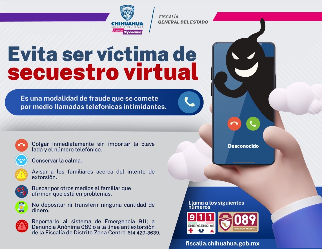 El secuestro virtual es una modalidad de fraude que se comete por medio llamadas telefónicas intimidatorias de índole extorsiva, en la que el delincuente busca engañar a quienes las reciben, diciéndoles que tienen privado de su libertad a un ser querido, por el cual exigen el pago de un monto económico como pago de un rescate y dejarlo en libertad.