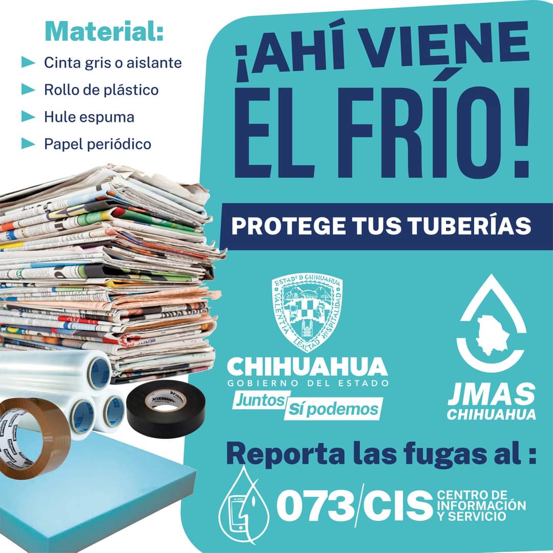 La Junta Municipal de Agua y Saneamiento (JMAS) de Chihuahua, dio a conocer las recomendaciones para el drenado y protección de las tuberías de comercios y domicilios, para prevenir fugas por congelamiento ante el pronóstico de bajas temperaturas.