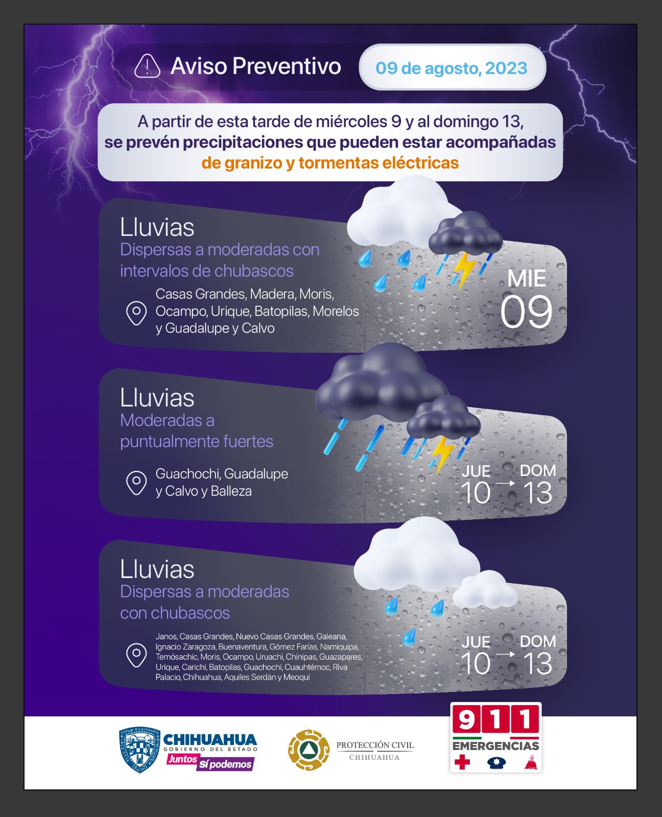 La Coordinación Estatal de Protección Civil (CEPC) informa que, debido a los efectos del monzón mexicano en circulación anticiclónica con niveles medios de la atmósfera y un canal de baja presión, se generarán precipitaciones en diversas zonas de la entidad a partir de esta tarde de miércoles 9 de agosto, y hasta el próximo fin de semana.