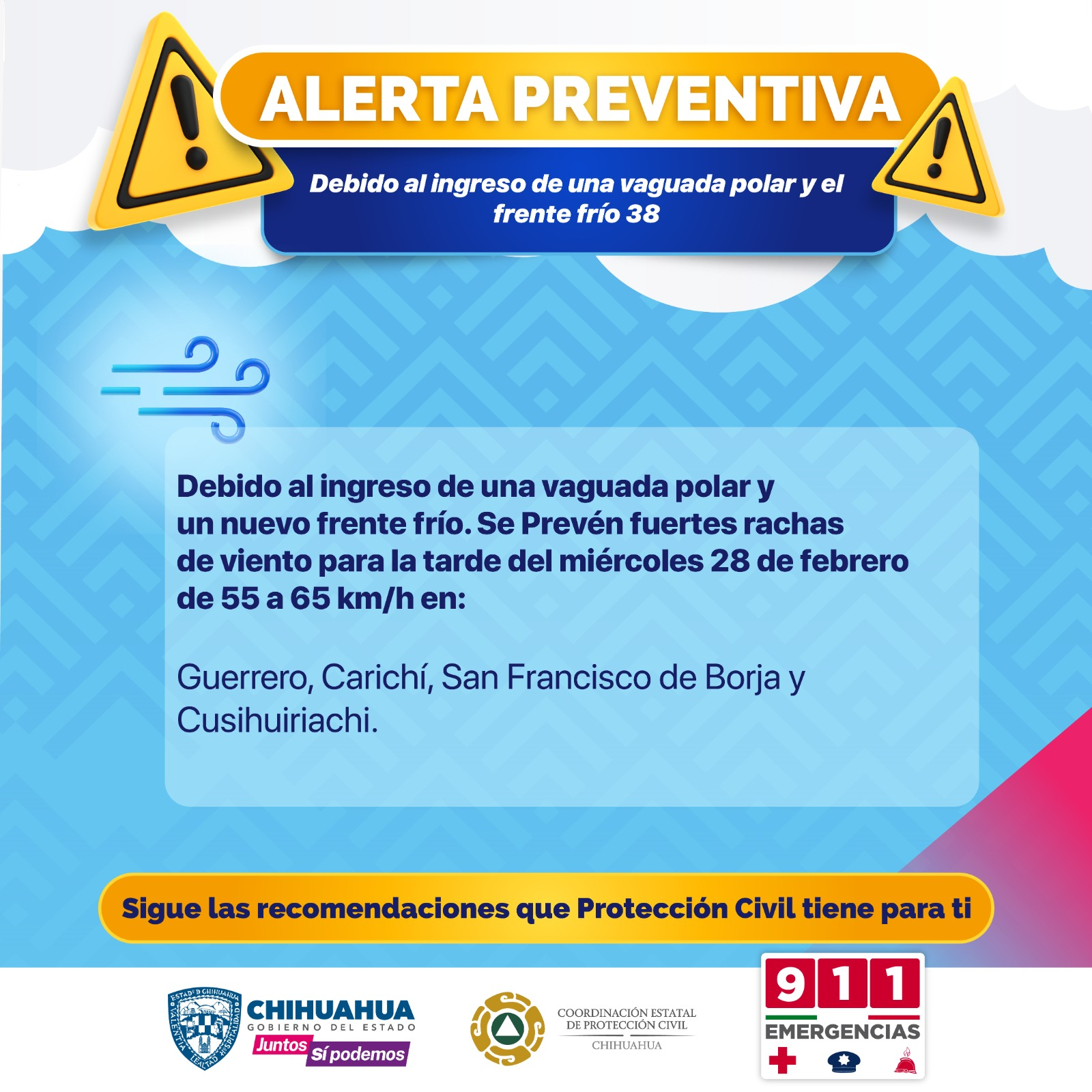 Con base en el pronóstico que emite el Servicio Meteorológico Nacional (SMN), la CEPC dio a conocer que estas condiciones son generadas por el ingreso de un nuevo frente frío al país, lo que ocasionará además descenso de temperatura.