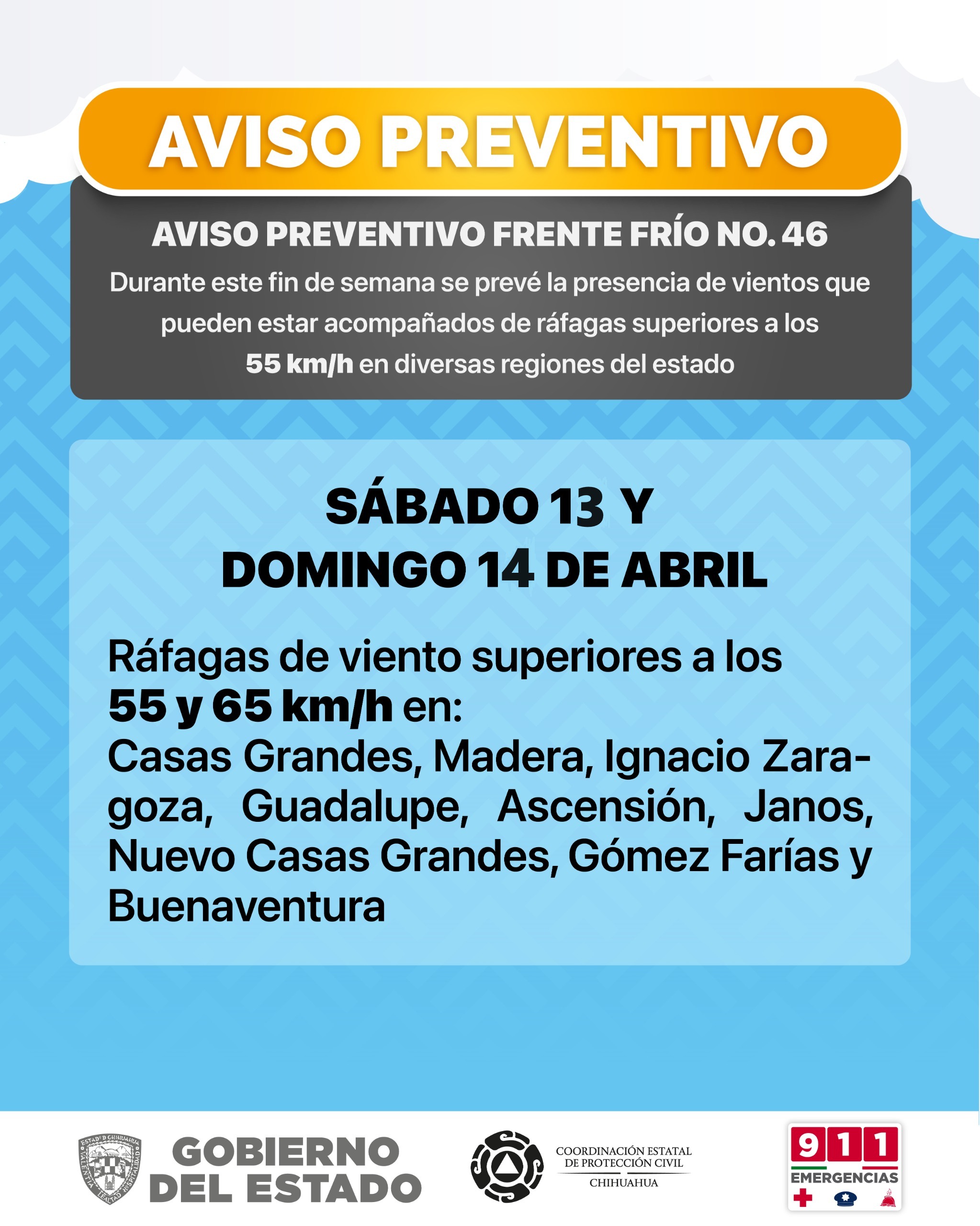 Habrá cielo de mayormente despejado a parcialmente nublado y los vientos pueden alcanzar rachas superiores a los 55 y 65 km/h en Casas Grandes, Madera, Ignacio Zaragoza, Guadalupe, Ascensión, Janos, Nuevo Casas Grandes, Gómez Farías y Buenaventura.