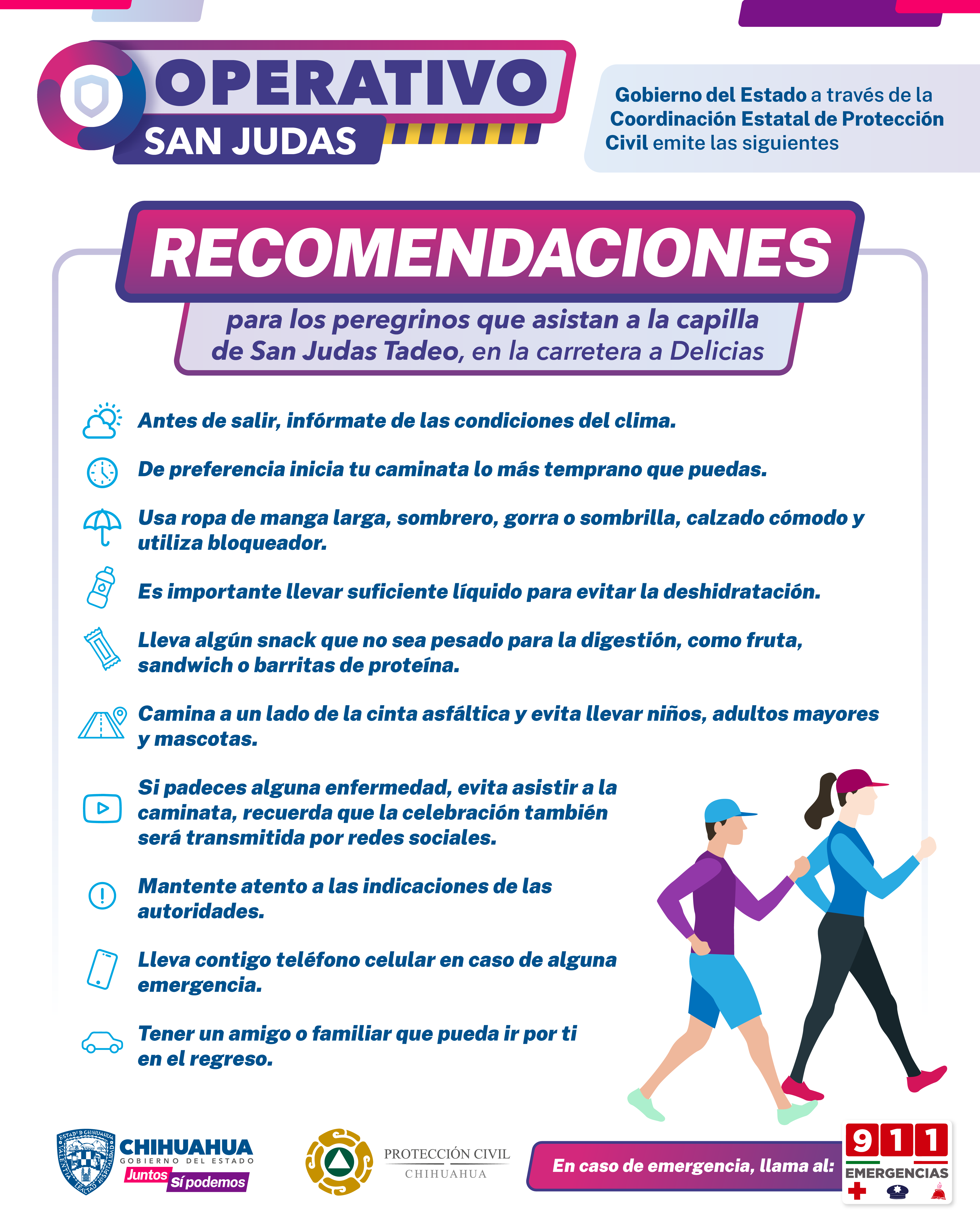 El Gobierno del Estado, a través de la Coordinación Estatal de Protección Civil (CEPC), emite una serie de recomendaciones para las y los peregrinos que participen este año en la caminata al templo de San Judas Tadeo, ubicado en el poblado de Tomás García, a desarrollarse los días 28, 29 y 30 de octubre.