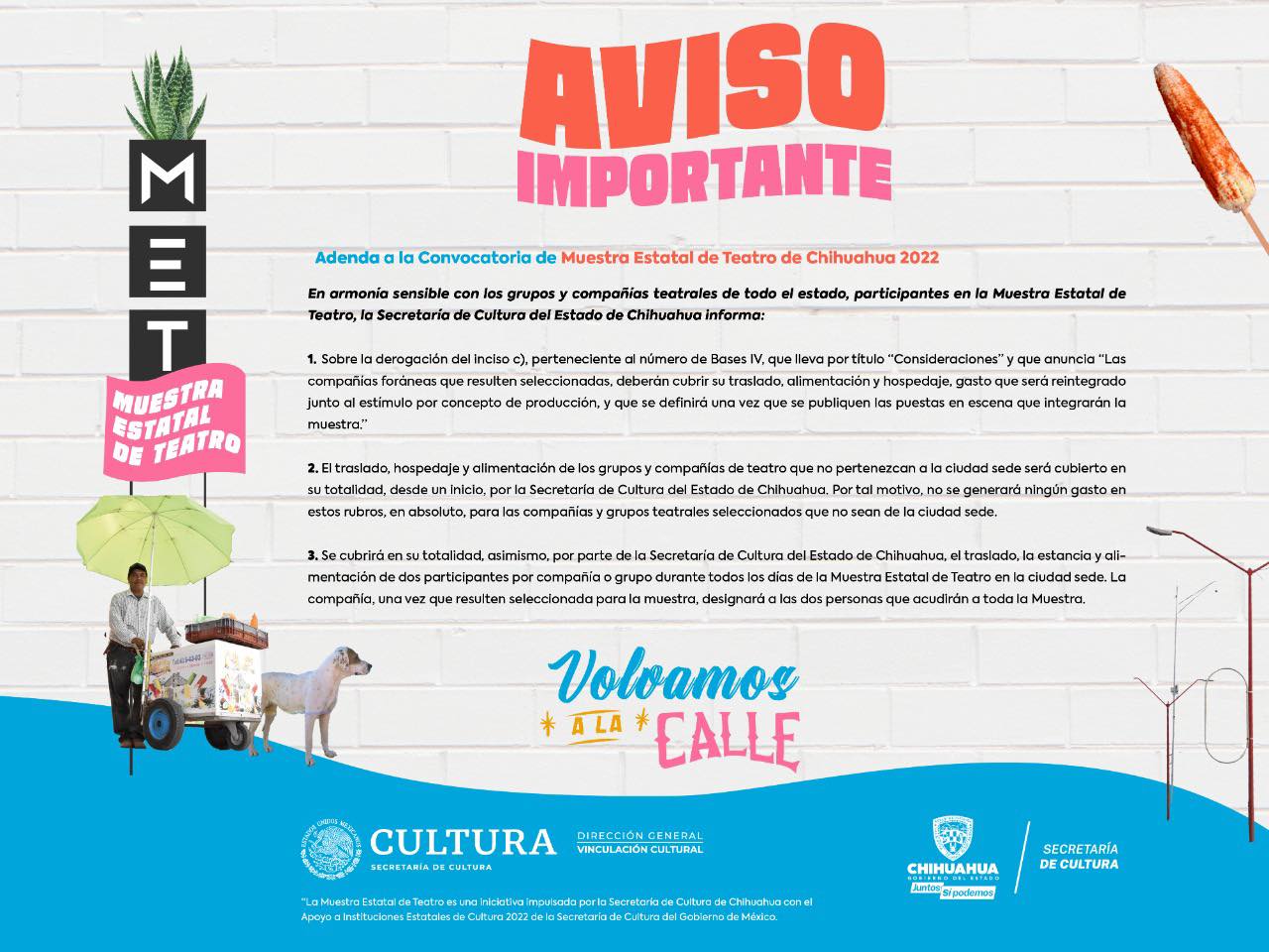La Secretaría de Cultura informa que se realizaron modificaciones a las bases de la convocatoria de la Muestra Estatal de Teatro 2022, por lo que la citada dependencia estatal cubrirá en su totalidad, los gastos por concepto de traslado, así como de hospedaje y alimentación durante los días que dure su presentación, a las compañías foráneas y agrupaciones no pertenecientes a Ciudad Juárez, que resulten seleccionadas.