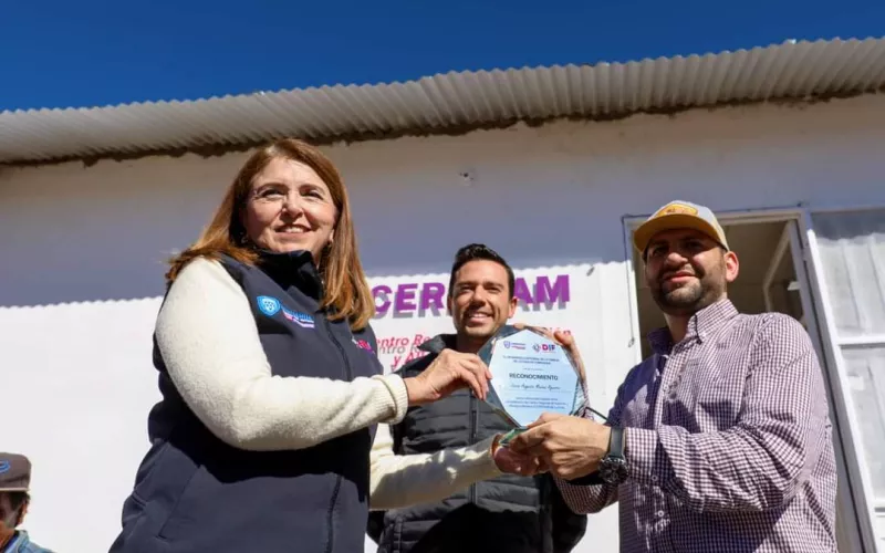 La directora de Alimentación y Desarrollo Comunitario, María de Lourdes Zaldívar Lozano, en representación de la presidenta del DIF Estatal, María Eugenia Galván Antillón, acompañada del secretario de Pueblos y Comunidades Indígenas (SPyCI), Enrique Rascón, hizo entrega de un reconocimiento al alcalde Jesús Augusto Medina Aguirre, por su compromiso de trabajar en conjunto para el bienestar de las mujeres e infantes en situación de alta vulnerabilidad.