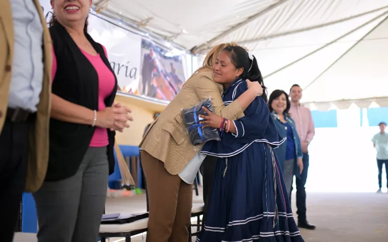 En un primer acto, la mandataria estatal, acompañada de la secretaria de Educación y Deporte, Sandra Gutiérrez Fierro y del secretario de Pueblos y Comunidades Indígenas, Enrique Rascón, distribuyó de forma simbólica becas, uniformes escolares, y libros para las niñas y niños de escuelas de la región.