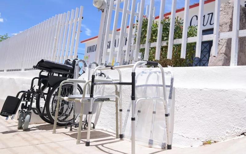 Para el equipamiento de este espacio fueron adquiridos aparatos médicos especializados, como el combo de electro estimulación, la mesa de tratamiento, un compresero frío, sillas de ruedas y de baño, andaderas, bastones de 1 punto y bastones de 4 puntos.