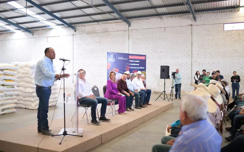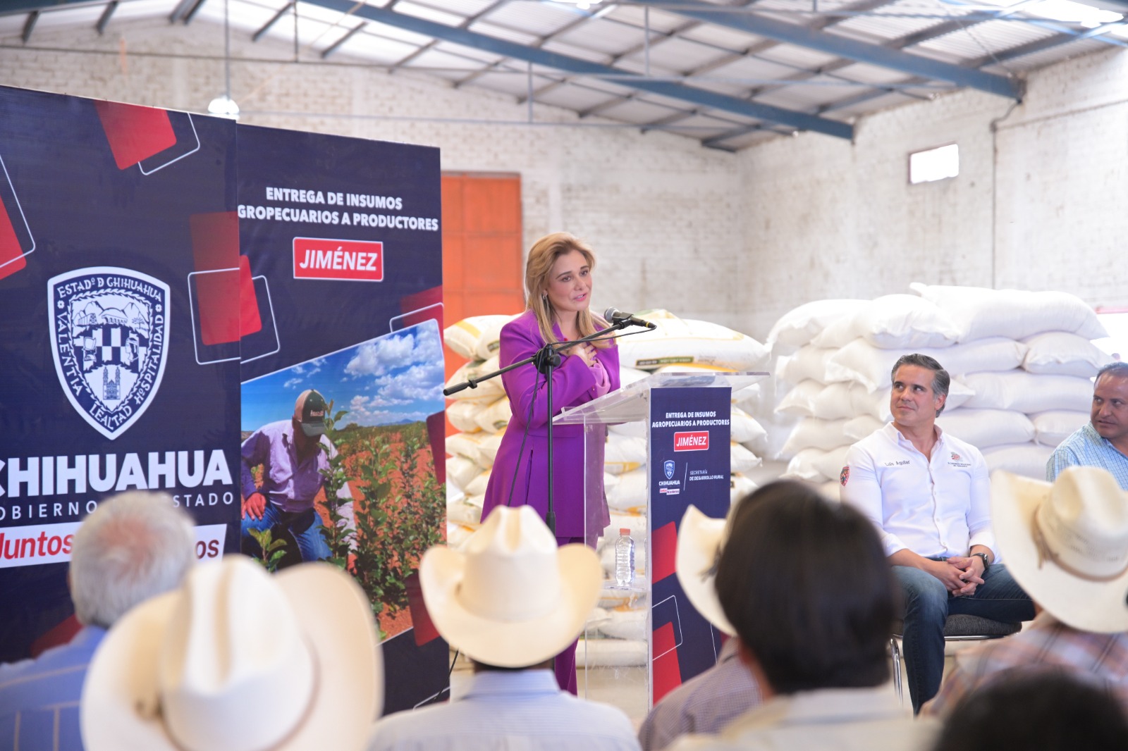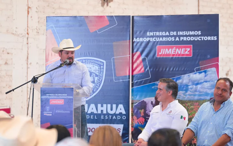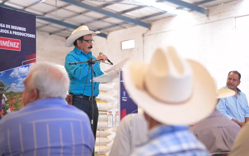 La Gobernadora Maru Campos entregó de manera simbólica un total de 34 toneladas de maíz rolado y 44 apoyos en subsidio para fertilizante, a productores de Jiménez y de los municipios de la región, como parte del programa de Entrega de Insumos Agrícolas.