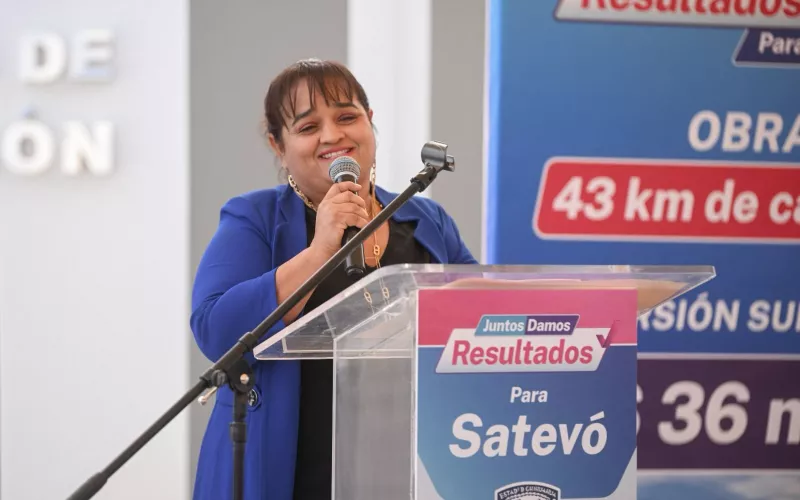 La alcaldesa de Satevó, Norma Muñoz, en su intervención agradeció los esfuerzos de la gobernadora Maru Campos, por transformar la calidad de vida de los habitantes del municipio.