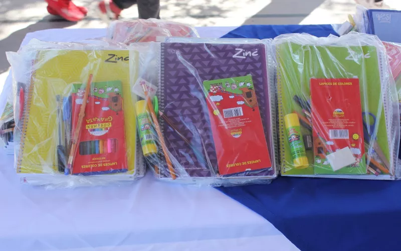 Cada paquete incluye cuatro cuadernos, colores, lápices, tijeras, borrador, sacapuntas, pegamento adhesivo y regla.