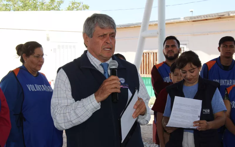 El evento protocolario del programa “Mochilatón 2023” se realizó en las instalaciones de la Escuela Primaria Socorro Rivera, de la colonia Granjas de San Rafael, ubicada en el sur de la ciudad.