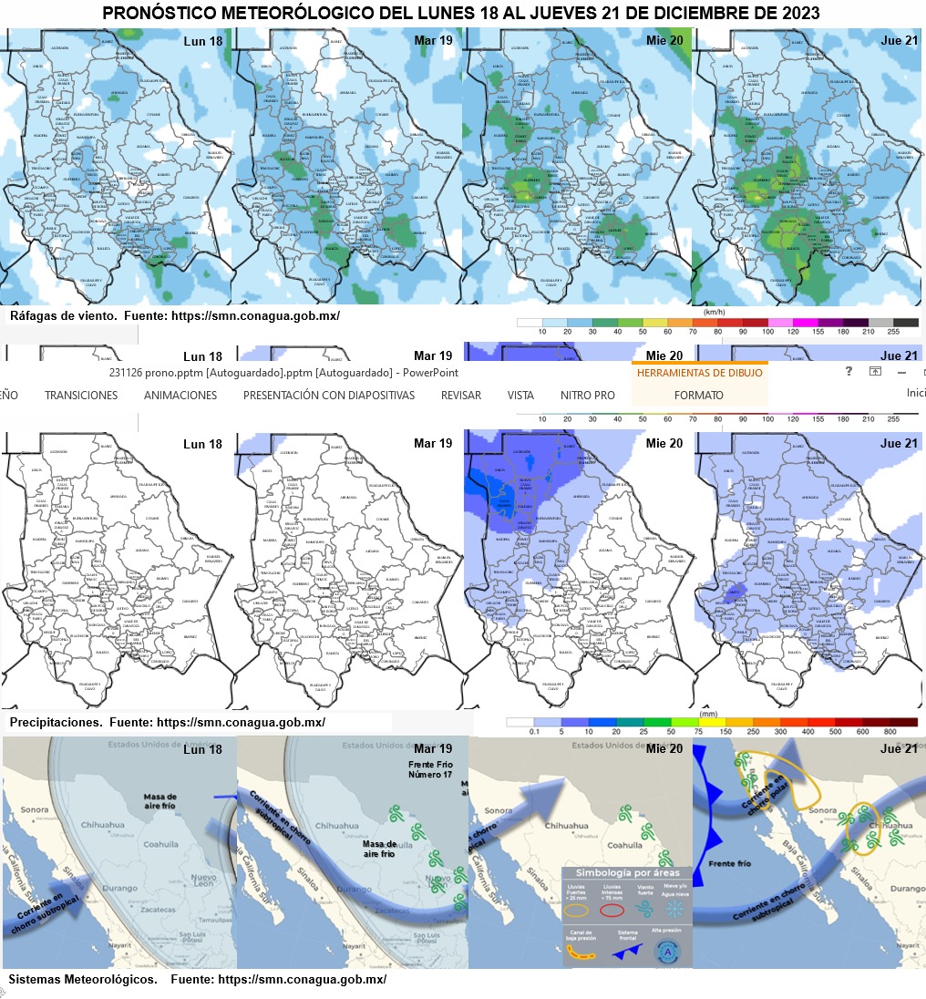 Las temperaturas máximas esperadas para esta tarde son (°C): Chihuahua 19, Juárez 18, Janos 17, Madera 18, Temósachic 20, Cuauhtémoc 16, Ojinaga 20, Delicias 19, Camargo 20, Jiménez 19, Parral 18, Creel 17, Chínipas 31, Guachochi 17, El Vergel 16.