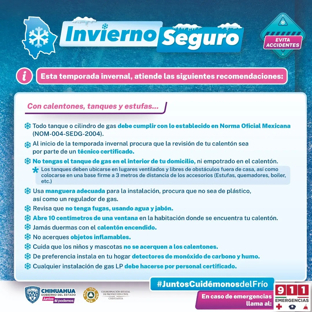 Con el objetivo de promover la seguridad y evitar percances en los hogares chihuahuenses, la Coordinación Estatal de Protección Civil (CEPC), exhorta a la ciudadanía a mantener las medidas precautorias para prevenir accidentes por el uso de calentones.