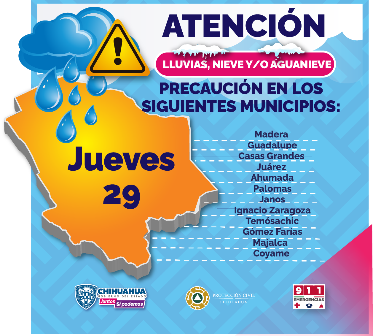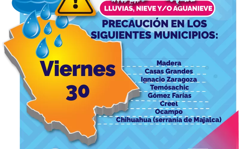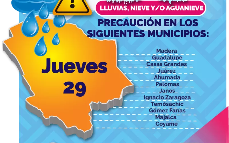 Además persistirá el pronóstico de lluvias nieve y/o aguanieve en Juárez Guadalupe, Ascensión, Janos, Nuevo Casas Grandes, Buenaventura, Namiquipa, Ocampo, Guerrero, Bocoyna, Chínipas, Cuauhtémoc, Chihuahua, Delicias, Camargo, Parral y Manuel Benavides.