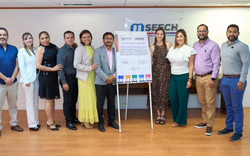 El director general de SEECH, Héctor González Estudillo, y la directora general de FECHAC, Erika Seyffert Ibarra, signaron el documento que da pie al lanzamiento de la convocatoria que en esta ocasión se dirige a las escuelas de la región noroeste, que incluye Casas Grandes, Nuevo Casas Grandes, Janos, Ascensión, Galeana y Buenaventura.