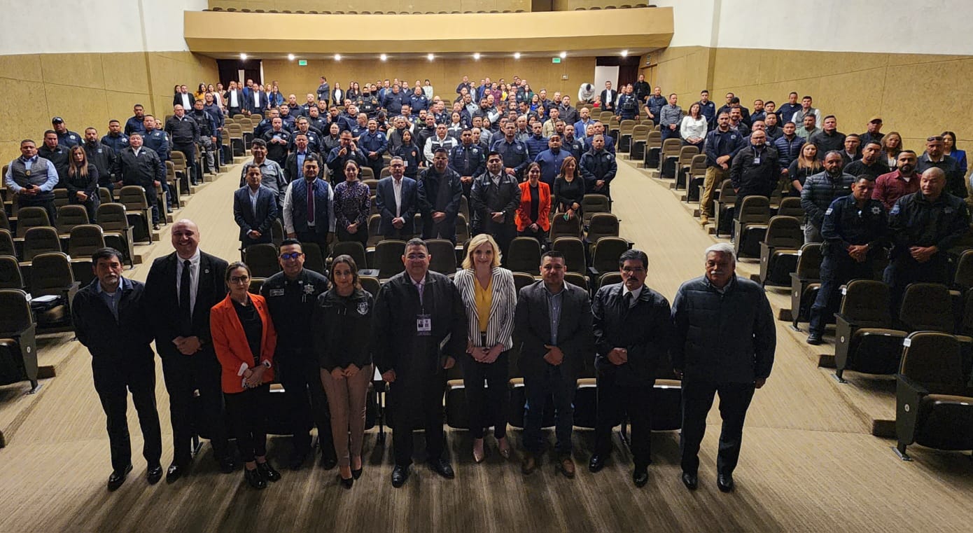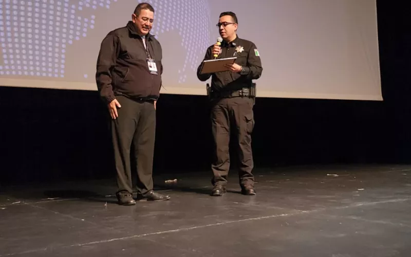 La conferencia se realizó en el Teatro Gracia Pasquel de la Universidad Autónoma de Ciudad Juárez, lugar al que se dieron cita mandos y elementos de corporaciones de seguridad, tanto municipales como estatales y federales.
